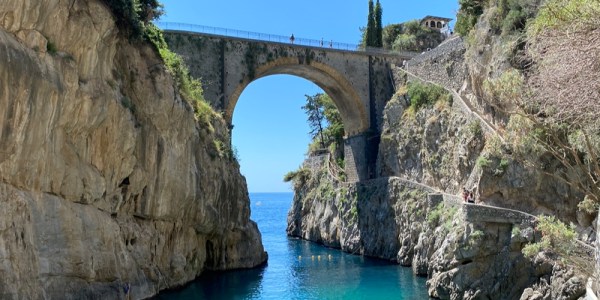 Foto mítica donde las haya en la Costa Amalfitana. Lo curioso de este mini fiordo es que alberga una playa de entrada libre y que está «cerrado» por un puente de arco de piedra (carretera principal de la costa).